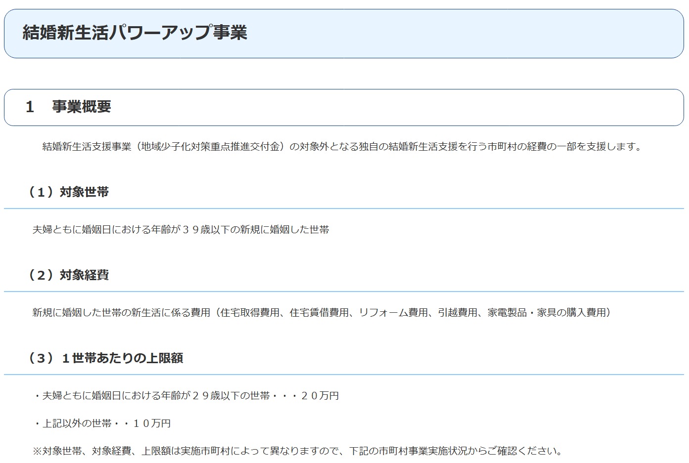結婚を控えている方は、まずは「お住まいの市区町村名+結婚新生活支援事業」で検索し、公式ページを確認してみましょう。