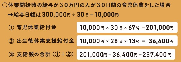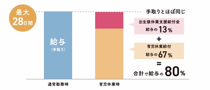 夫婦がともに14日以上、育児休業(または産後パパ育休)を取得すると最大28日間、育児休業給付金が13%上乗せされる制度です。