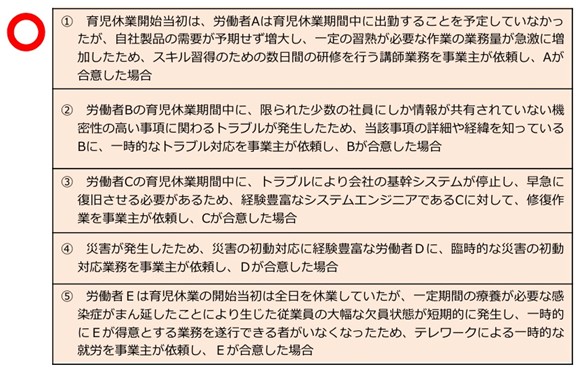 恒常的・定期的な就業は育児休業していることになりません。「一時的・臨時的な就労」に該当しないケースは次のような例です。
