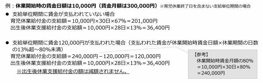 育児休業給付金の支給額=休業開始時賃金月額の80%-支払われた賃金