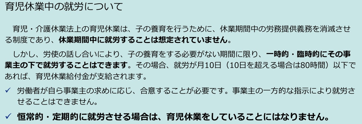 ただし、本人と会社の話し合いにより、子どもの養育をする必要がない期間に限り、一時的・臨時的な就労を行うことは認められています。