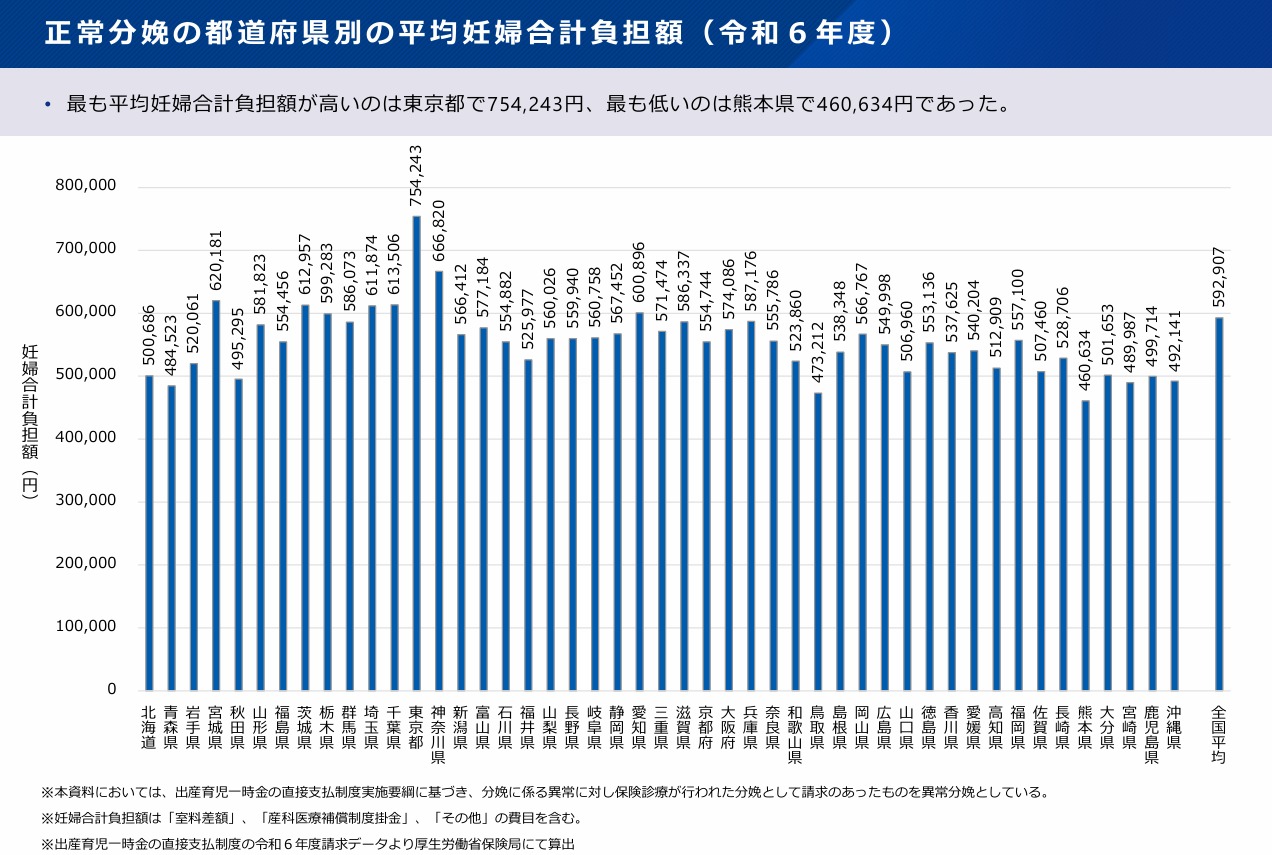 正常分娩の都道府県別の平均妊婦合計負担額(令和6年度)は592,907円です。つまり、50万円では足りないケースが多いということです。